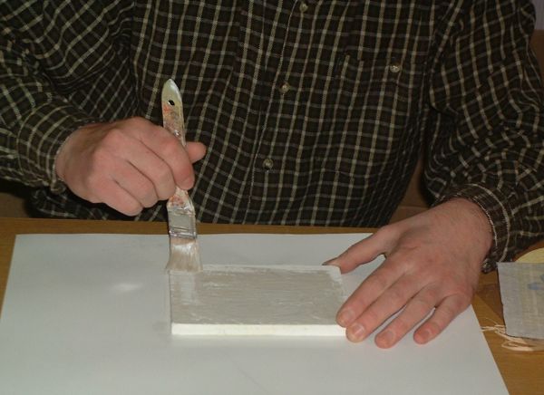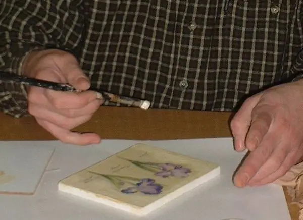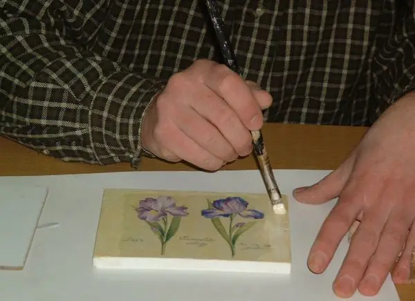 Ez a fólia felszippantja a szalvétát, amit ezután félreteszünk. Ezután a ragasztót ecsettel felkenjük a fatáblára, majd szivacshengerrel szépen egyenletesen eloszlatjuk a felületen. Ez azért fontos, hogy ne legyen sok ragasztó a szalvéta alatt! Ezután a fóliával együtt ráhelyezzük a szalvétát a beragasztózott felületre, pontosan oda, ahová elterveztük.