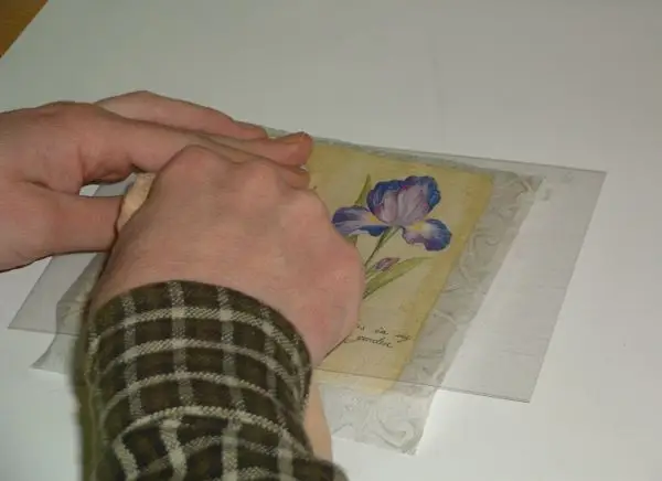 A műanyagfóliát 1-2 cm-el nagyobbra vágjuk, mint amekkora fatáblára (felületre) dolgozunk. A szalvétát ezután ráhelyezzük a fatáblára, oda, ahová ragasztani szeretnénk, majd rátesszük az előzőleg valamilyen műszálas ronggyal megdörzsölt fóliát.