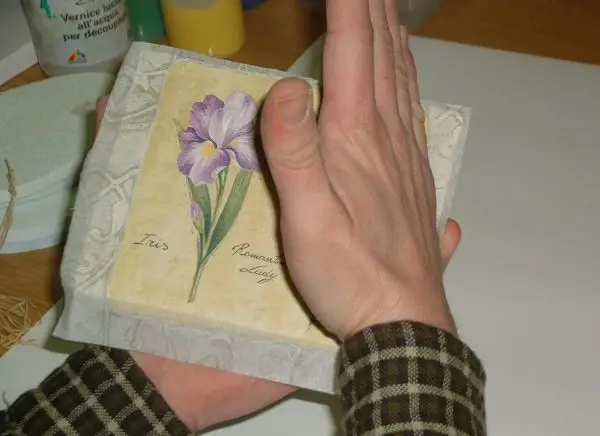 Középről kifelé haladva a fólián keresztül rásimítjuk a szalvéta mintát az alapra. Óvatosan levesszük a fóliát, majd a felragasztott szalvétát még kézzel rányomkodjuk a felületre (ahol szükséges). A szalvétát ezután hagyjuk megszáradni, a félretett fóliát viszont érdemes elmosni, az esetlegesen átszivárgott ragasztótól.