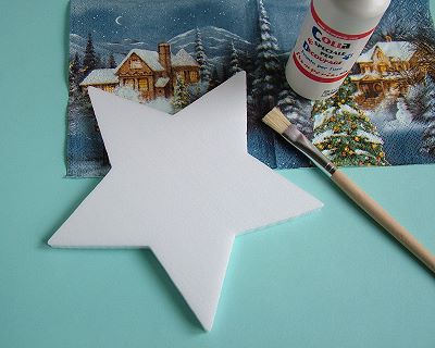 Fektessük a csillagot a mintás felével lefelé, majd egy vékony ecsetet vízbe mártva vizezzük be a szalvétát a csillag körül. Ezután a szalvétát a nedves csík mentén óvatosan tépjük le. A forma hátsó részét akrilfestékkel fessük be, de ha a dekorációnkat az ablakba szánjuk, akkor a dekorforma mindkét oldalát díszíthetjük szalvéta motívumokkal.
