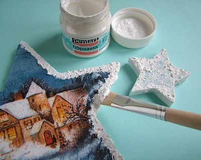 A csillag felületére nagyobb mintájú szalvétát választhatunk. A szalvéta legfelső rétegét leválasztjuk a többitől. Ráhelyezzük a formára, és felülről ragasztólakkal a felületre simítjuk, majd hagyjuk megszáradni.