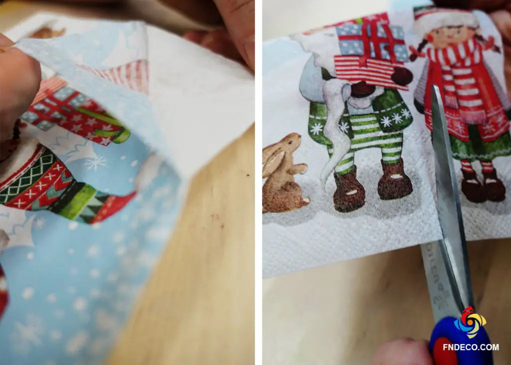 Szalvéta legfelső mintás rétegét szedjük szét, majd vágjuk körbe a motívumokat, amelyeket szeretnénk dekupázsolni.