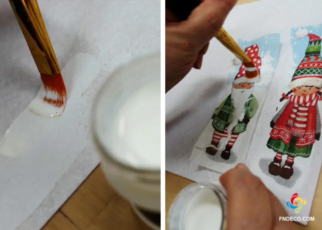 Kenjünk textil decoupage ragasztót a motívumok alá (textil decoupage ragasztó száradás után is rugalmas marad), majd helyezzük rá a körbevágott szalvétát. Felülről is kenjük át a felületet, majd várjunk amíg megszárad a filclapunk. Száradás után egy sütőpapíron-anyagon keresztül közepes hőfokon vasaljuk át a filclapunkat.