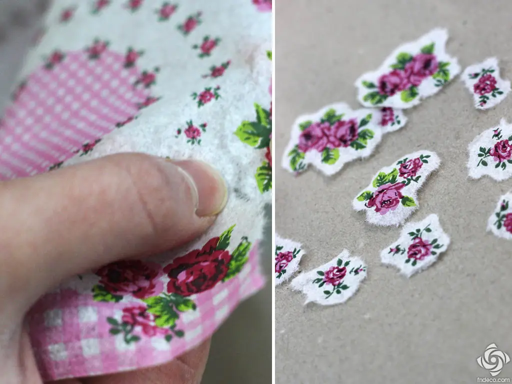 4. A szalvéta minta ollóval történő kivágása helyett használjunk kissé bevizezett vékony ecsetet, kontúrozzuk körbe a mintákat, így könnyedén ki tudjuk tépni a kiválasztott mintákat.