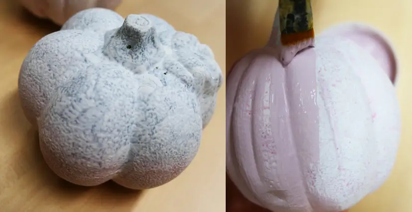 Száradás után Dekor paint softtal festettük át a tököket. Két színt használtunk – egyik tököt viktoriánus rózsaszínre, a másikat pedig galambszürke színre festettük. Egy rétegben szintetikus lapos ecsettel egyenletesen vittük fel a festéket. Krétafestékből adódóan egy szép púderes felületet kaptunk.